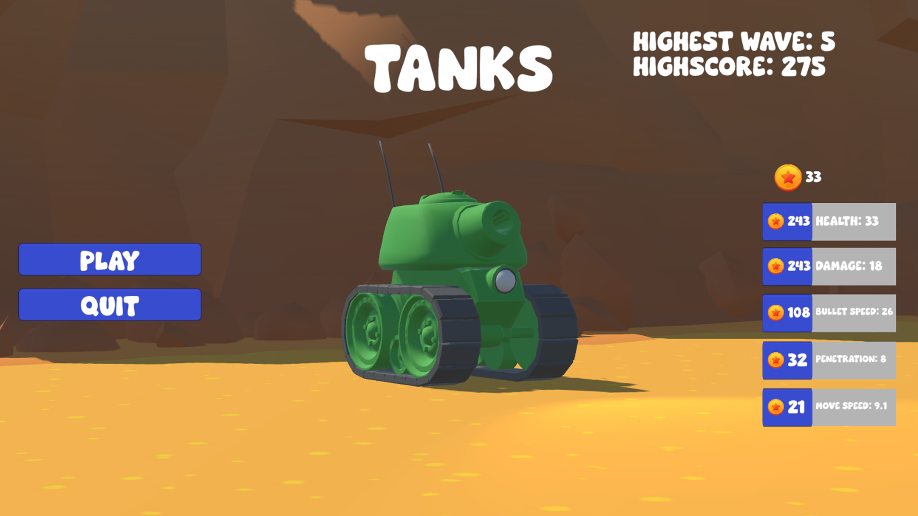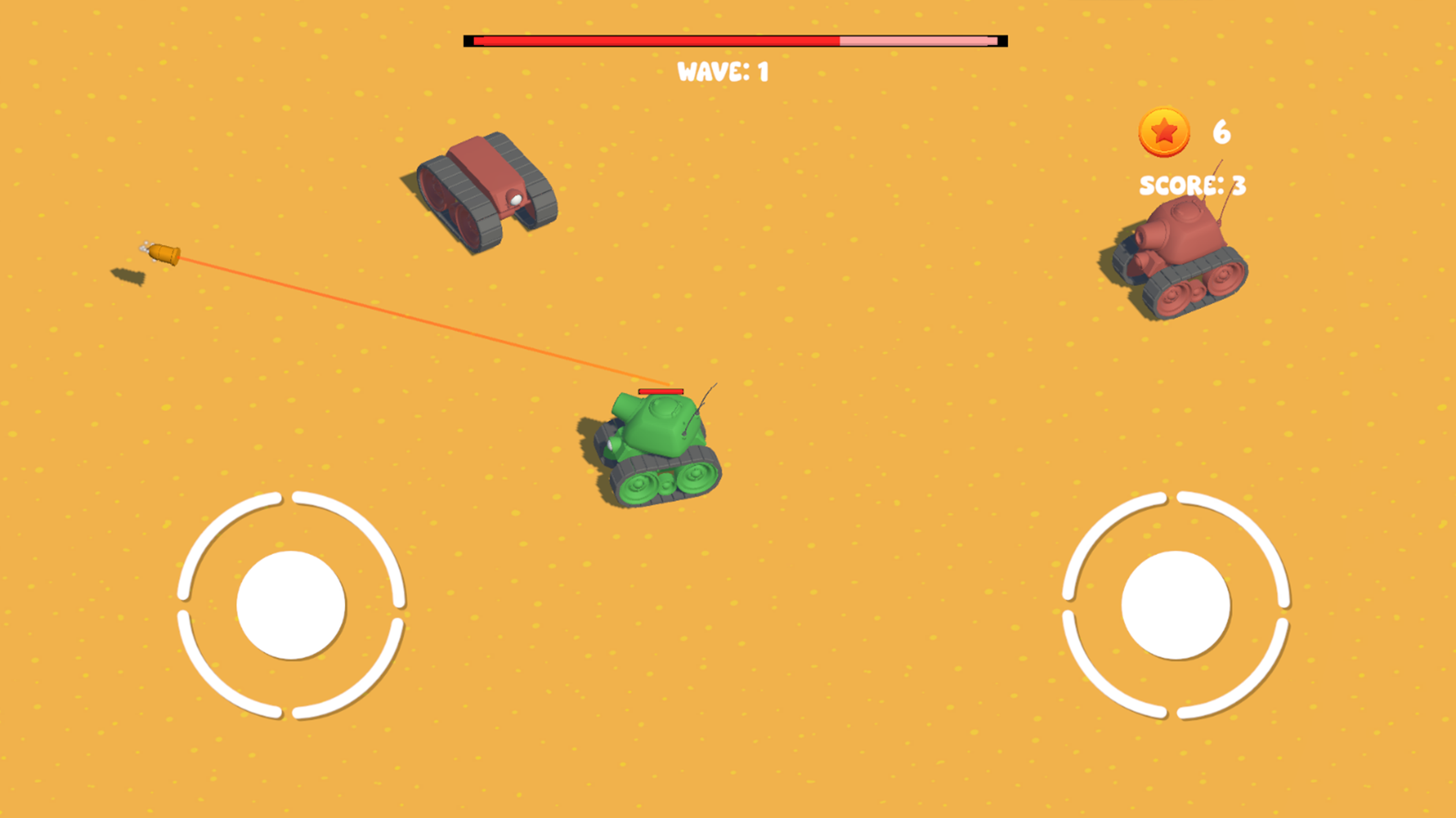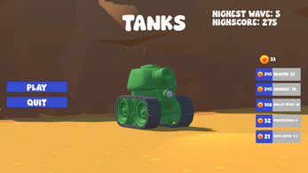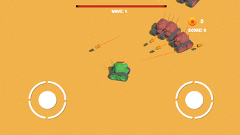 This is "Tank Chaos". It is a 2.5D top-down shooter which involves controlling your tank with both sticks to shoot and move. Throughout gameplay, enemies are spawned in waves, they progressively get more and more challenging, with their health and damage increasing. Through gameplay, you will receive coins, which you can use to upgrade the stats on your tank so that you can survive longer, to a higher wave and earn even more coins for further upgrades.